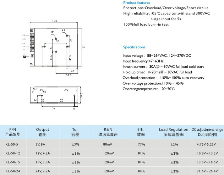 高可靠性:105C長(cháng)壽命電容,能承受300VAC輸入電壓5秒不損壞