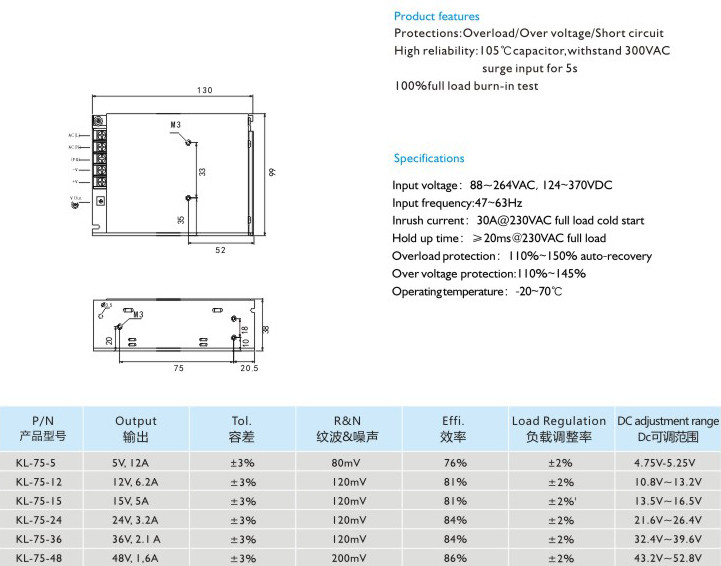 高可靠性:105C長(cháng)壽命電容,能承受300VAC輸入電壓5秒不損壞