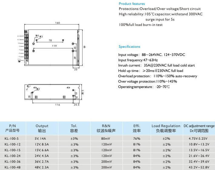 高可靠性:105C長(cháng)壽命電容,能承受300VAC輸入電壓5秒不損壞